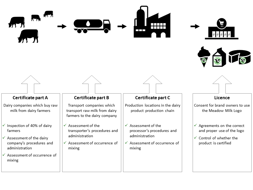 As the owner of the Meadow Milk logo, the Grazing Foundations establishes the conditions. Producers in the production chain of a meadow dairy products are certified. Trademark owners of products that use the Meadow Milk logo request a license.